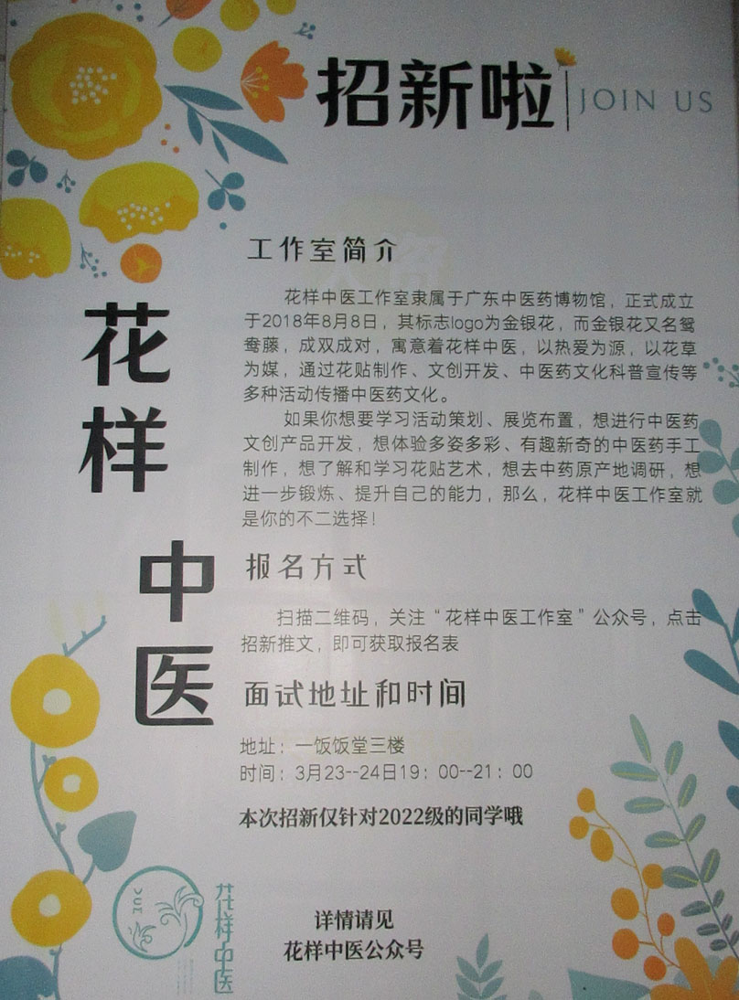 | 花样中医工作室招新 3月23-24日晚19点-21点 地点:生活区一饭三楼 本次招新只面向2022级新生 | ||||||