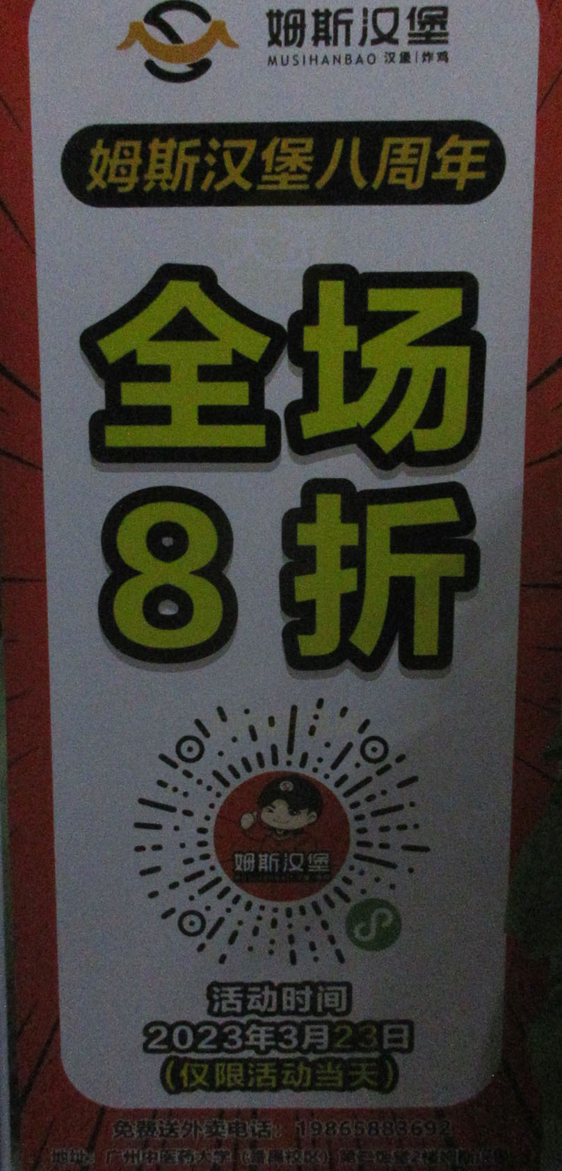 广中医生活区二饭二楼北列东第二档 姆斯汉堡八周年活动2023.3.23当天 全场8折 |