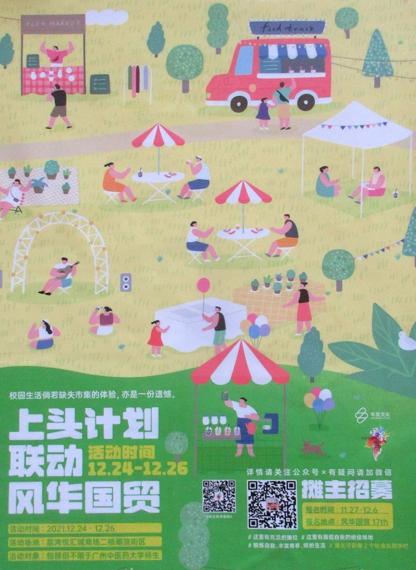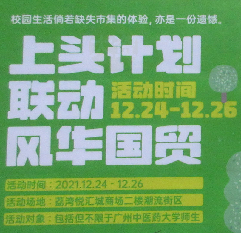 广中医 活动预告 第17届风华国贸集市 报名时间11.27-12.6 活动时间12.24-26 地点:荔湾悦汇城商场二楼潮流街区 是不是第一次不在大学城广中医校园(生活区)内进行