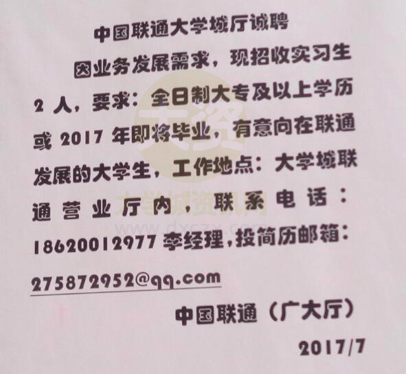 中国联通大学城营业厅(广大商中内)诚聘实习生2名