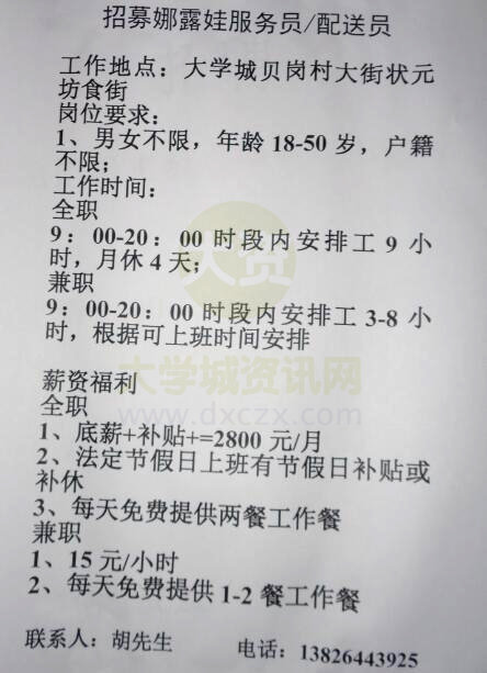 招募娜露娃服务员&配送员 工作地点:大学城贝岗村大街状元食坊