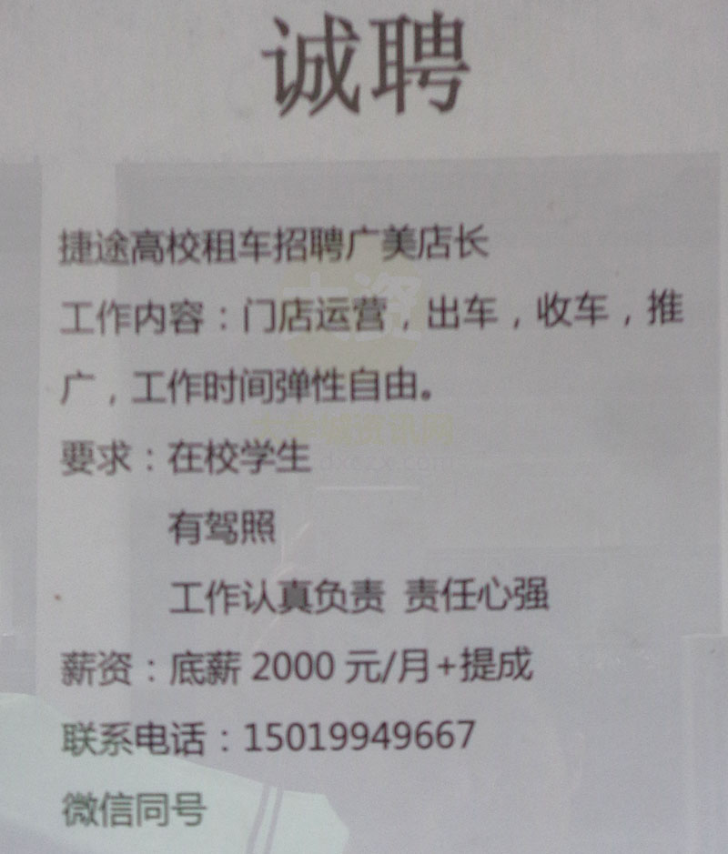 捷途高校租车招聘广美店长 要求:在校生 有驾照