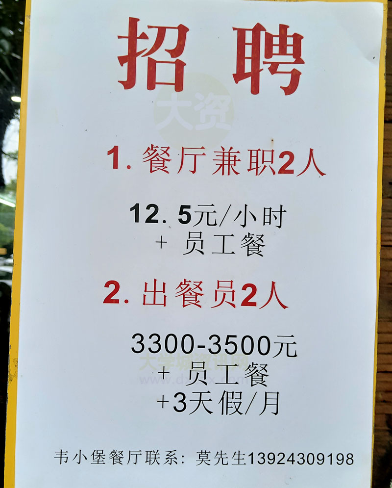 北亭临中环路列店-韦小宝餐厅招聘餐厅兼职2人 12.5元/小时+员工餐 联系13924309198莫先生