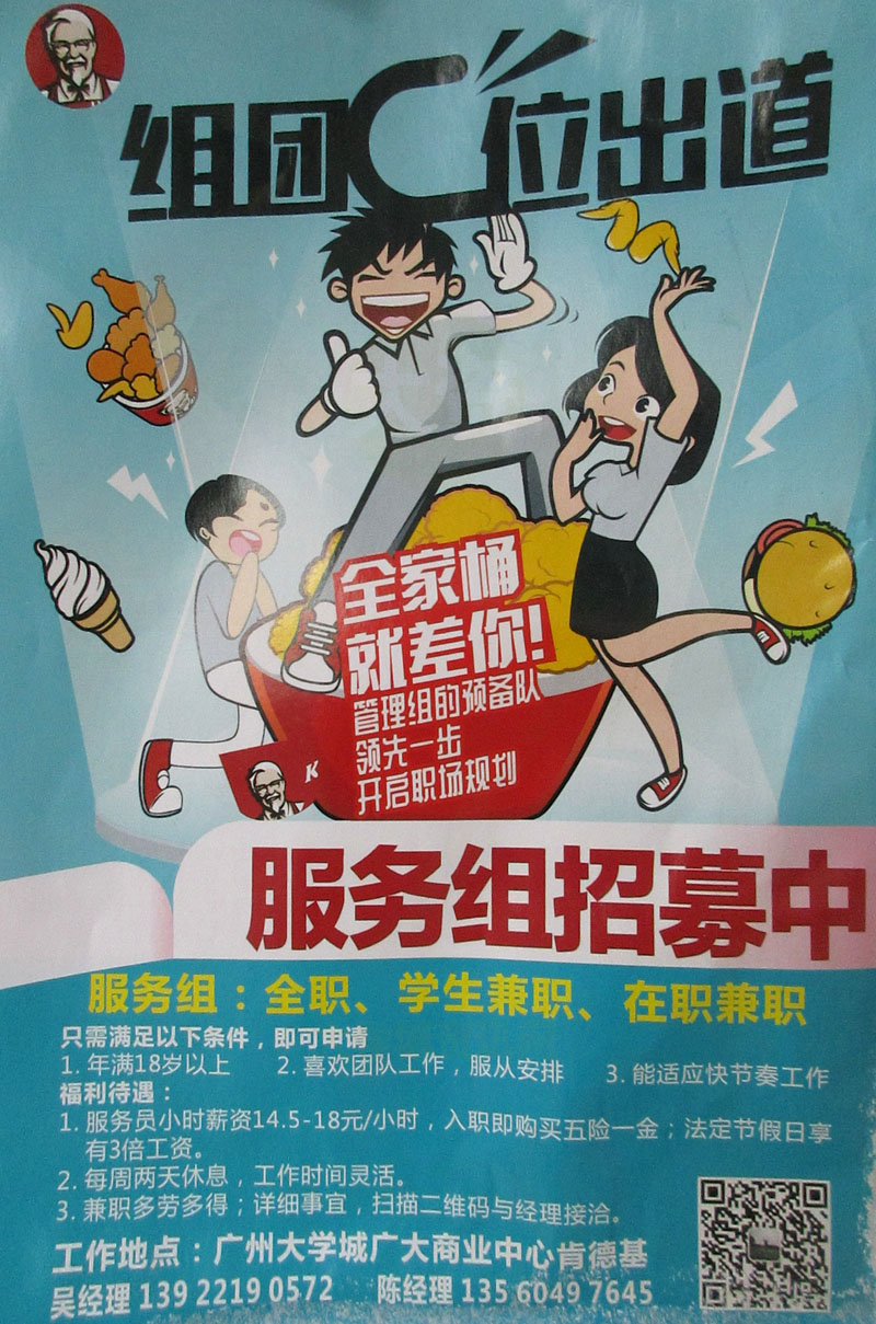 广州大学商业中心肯德基服务组招聘招募中 全职兼职皆可