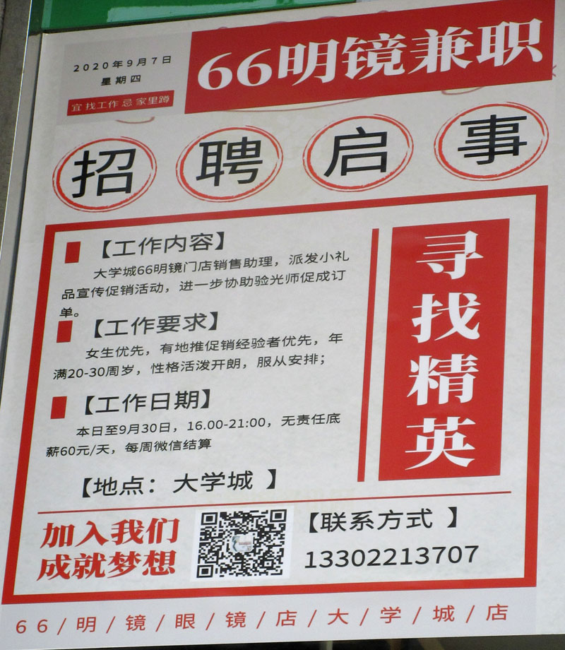 66明镜兼职招聘启事 大学城66明镜门店销售助理 派发小礼品宣传促销活动