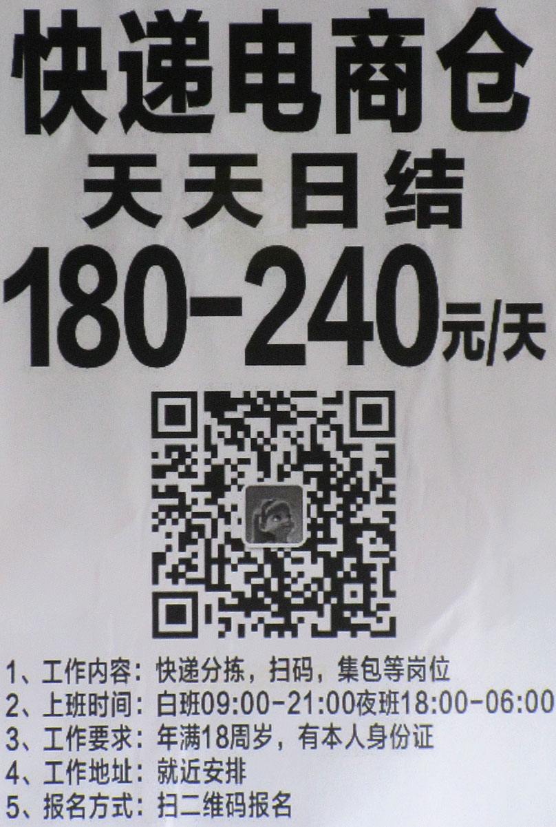 本地兼职 快递电商仓 天天日结 180-240元一天 :快递分拣,扫码,集包等 分白夜班 扫码即可报名
