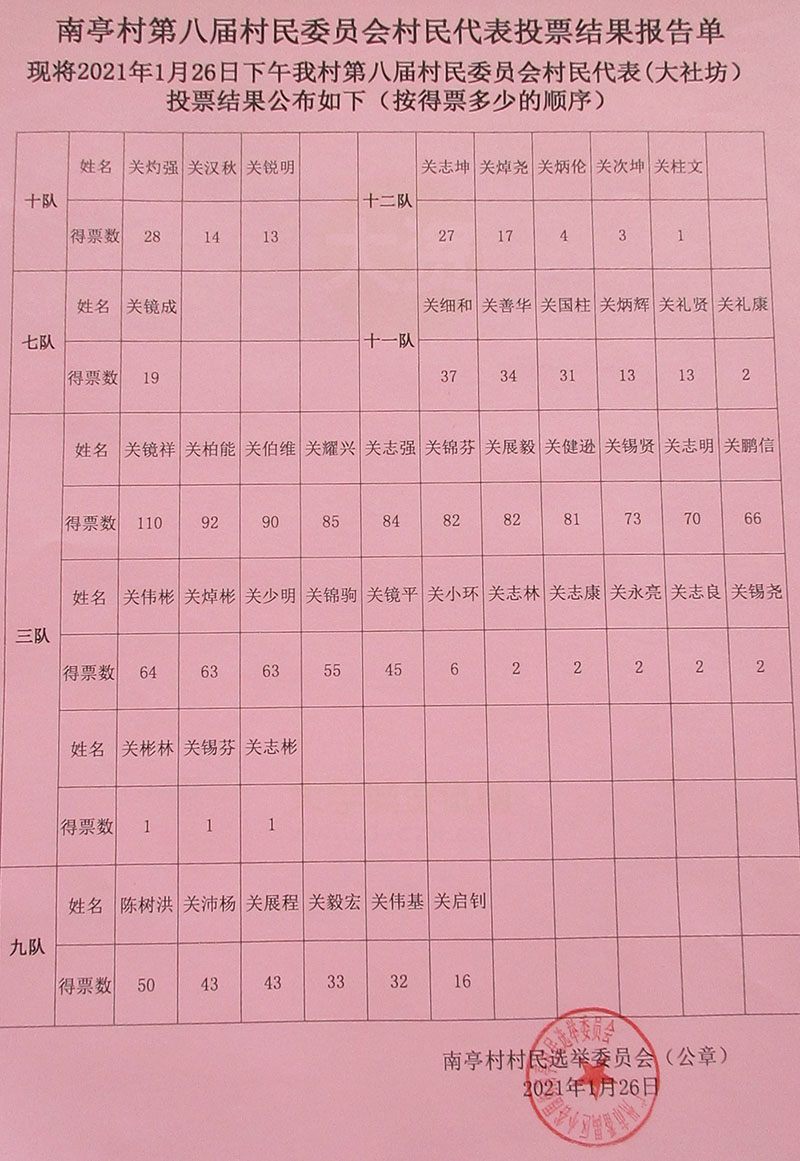 | 南亭村第八届村民委员会选举之(大社坊)村民代表投票结果公布 | ||||||