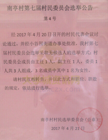 | 南亭村第七届村民委员会选举公告(第4号) | ||||||