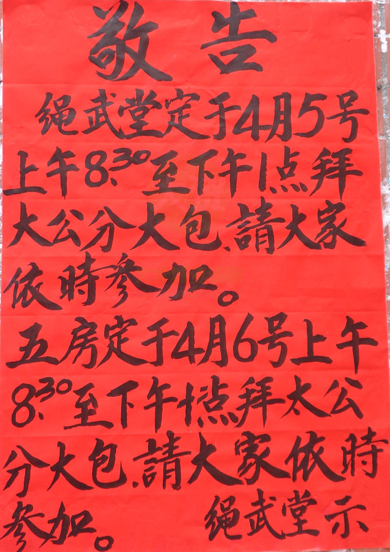 | [敬告]五房定于4月6号上午8.30至下午十二点拜太公分大包 绳武堂示 | ||||||