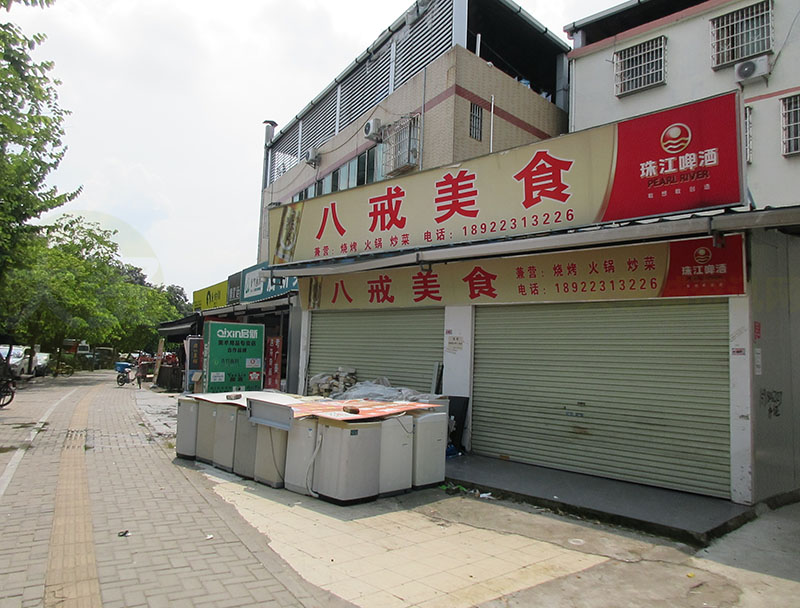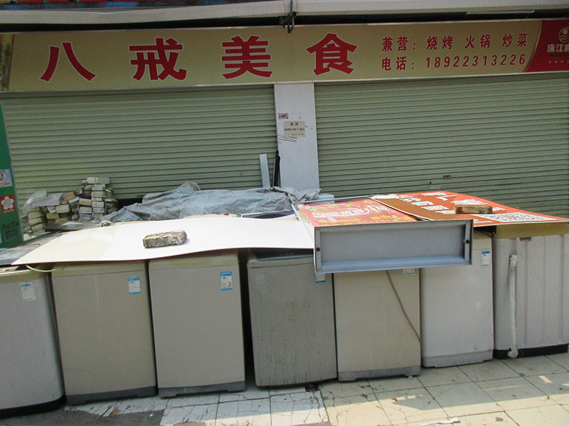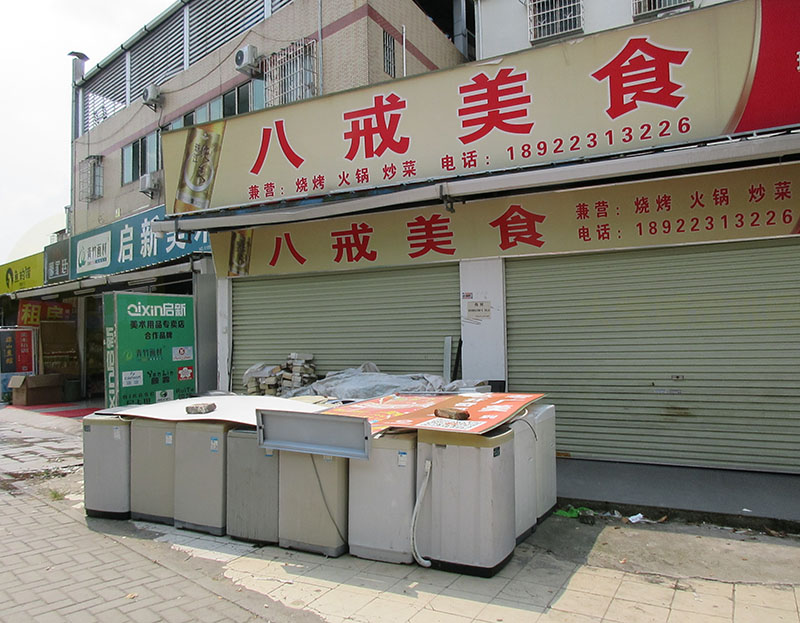 南亭北路(南亭村大街)西-八戒美食店门前-摆放了一些洗衣机,看似不是新的,应该是那些毕业的大四生卖二手回收或者之前大一时购买有协议四年毕业后折价返还回购到卖家手中