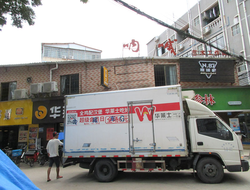 | 南亭华莱士汉堡店前,运送专车正在进货、配成品和原材料等 | ||||||