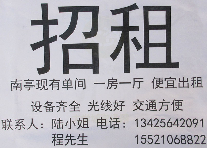 | [招租]南亭现有单间 一房一厅 便宜出租 设备齐全 光线好 交通方便 联系:陆小姐13425642091 程先生15521068822 | ||||||