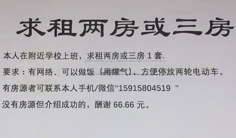 | 南亭 求租两房或三房 要求有网络、可以做饭,方便挺电动车等 有房源者可联系手机/微信15915804519 | ||||||