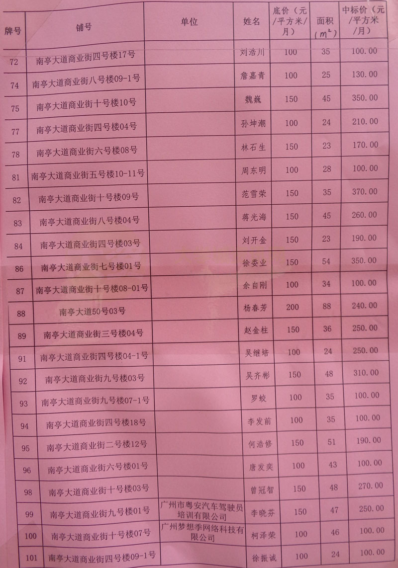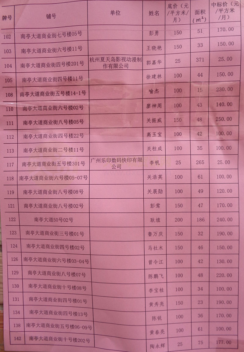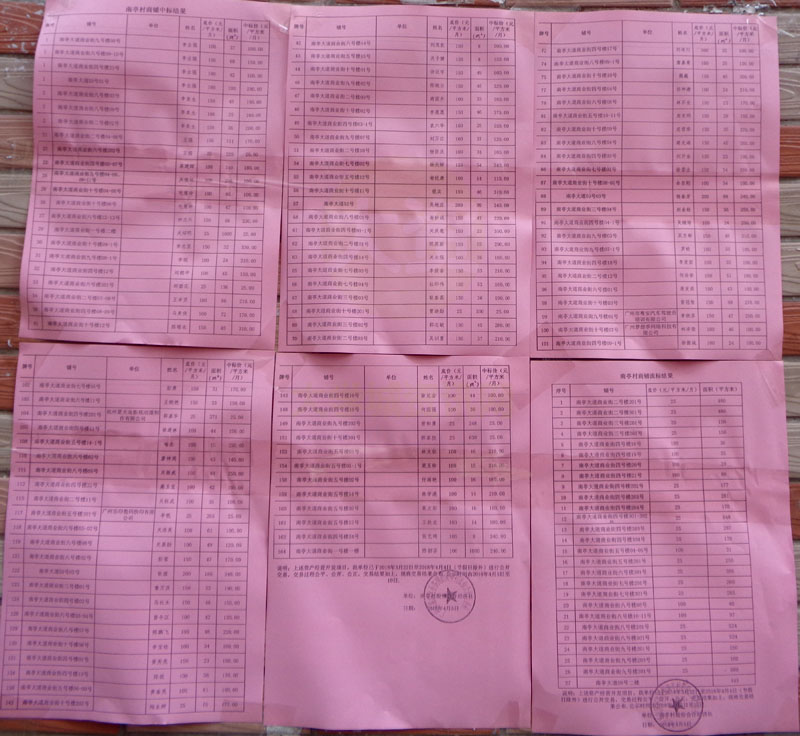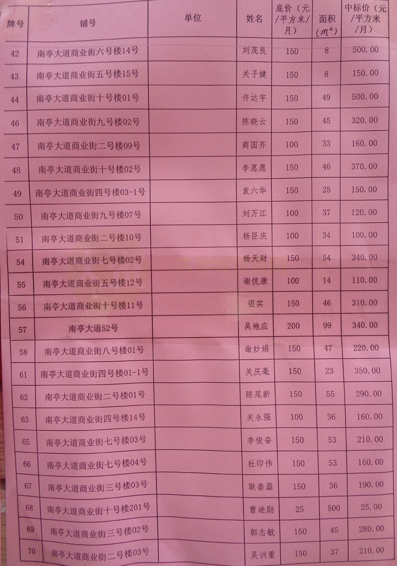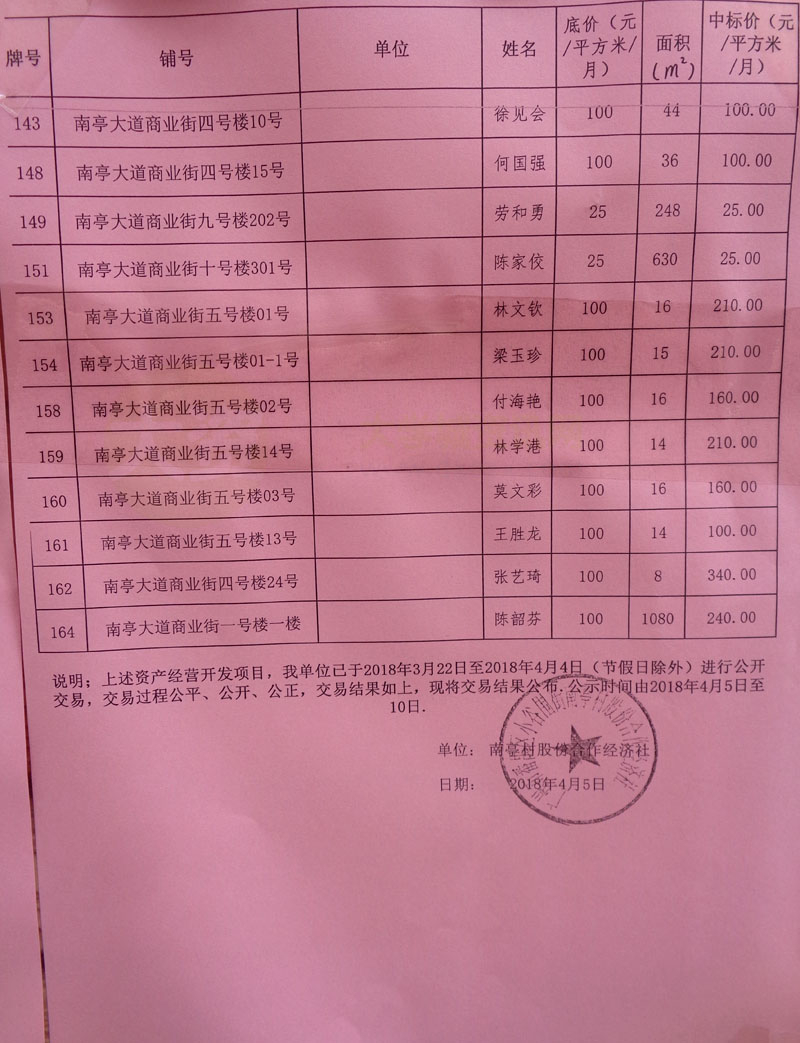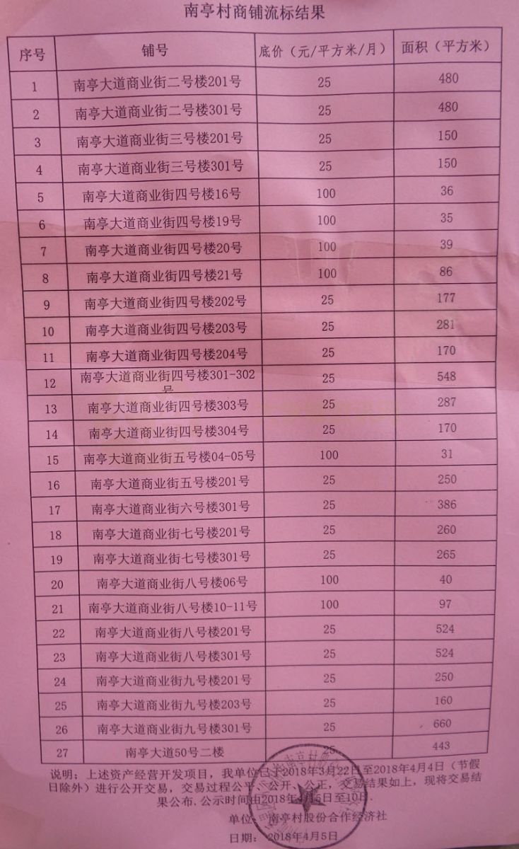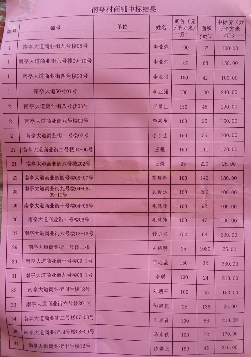 | 南亭村商铺中标结果&流标结果公布 | ||||||