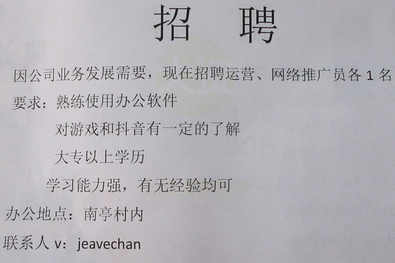 | 南亭村内 招聘运营、网络推广员各1名 | ||||||