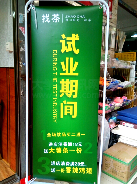 找茶的solgan是用心做好一杯茶 试业期间1全场饮品买二送一2进店消费满18元送大薯条一份3进店消费满28元送香辣鸡翅一份