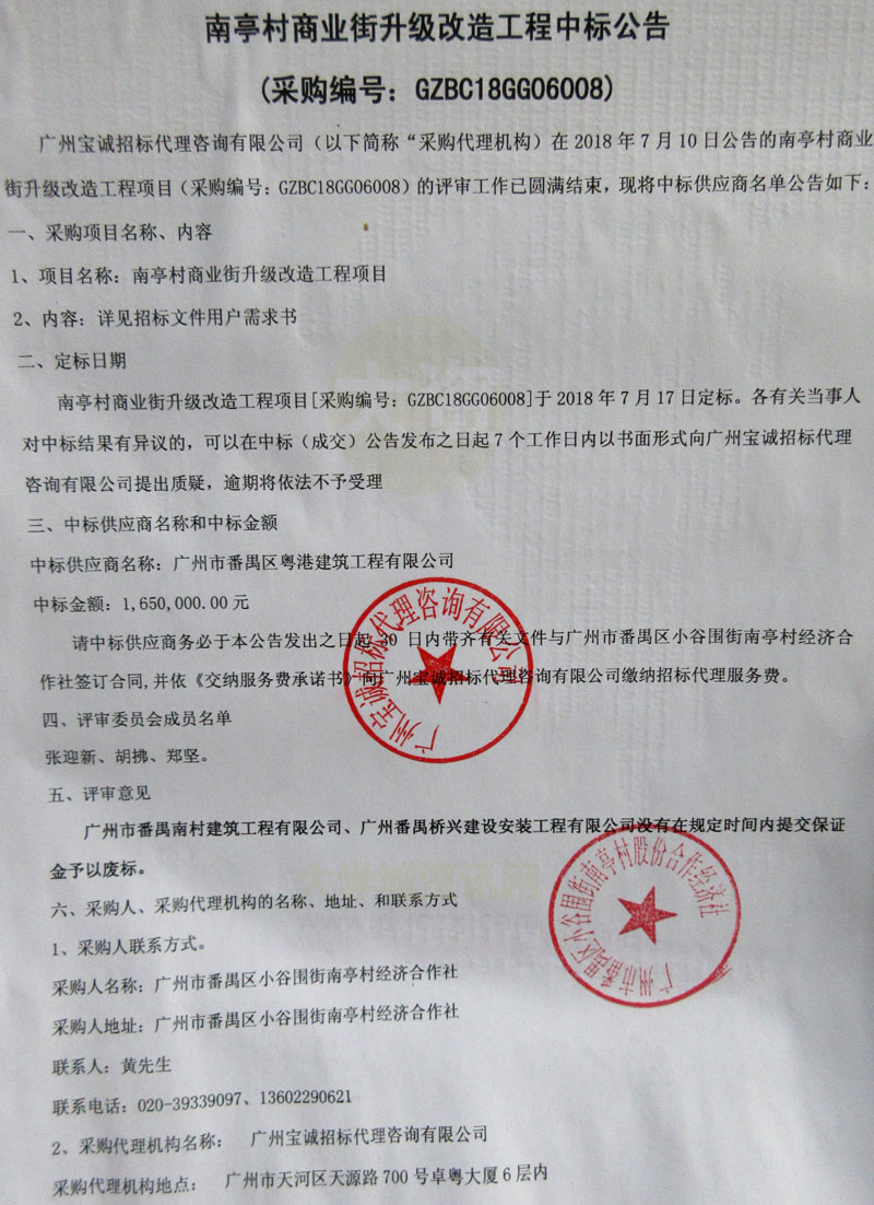 | 南亭商业街升级改造工程中标公告 | ||||||