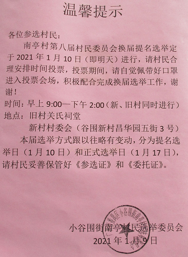 | 南亭村第八届村委换届提名选举定于明天(1.10)进行 | ||||||