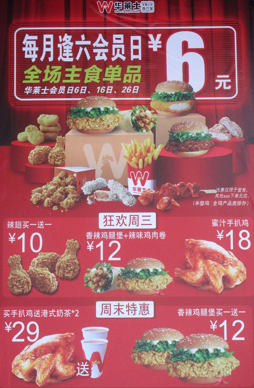 南亭大道中南 华莱士 每月逢六会员日 全场主食单品售价6元 狂欢周三(辣翅10元买一送一,香辣鸡腿堡+辣味鸡肉卷12元,蜜汁手扒鸡18元) 周末特惠(20元买手扒鸡送港式奶茶2杯,香辣鸡腿堡12元买一送一)