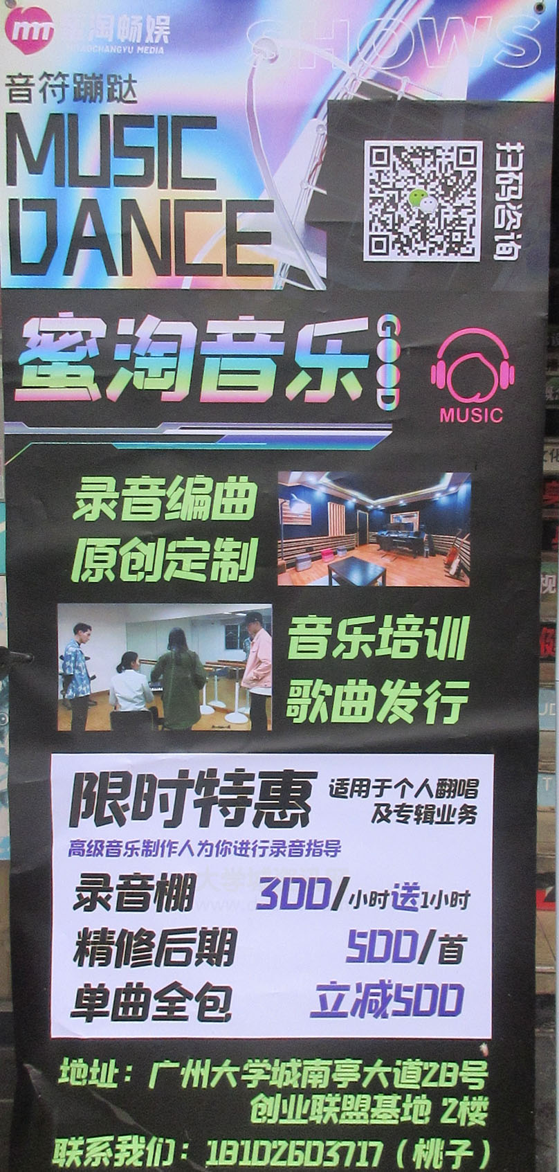 | 南亭大道南-蜜淘音乐 录音编曲,原创定制,音乐培训,歌曲发行 限时特惠:录音棚300元一小时再送一小时 精修后期500元一首 单曲全包立减500元 扫码了解咨询 | ||||||
