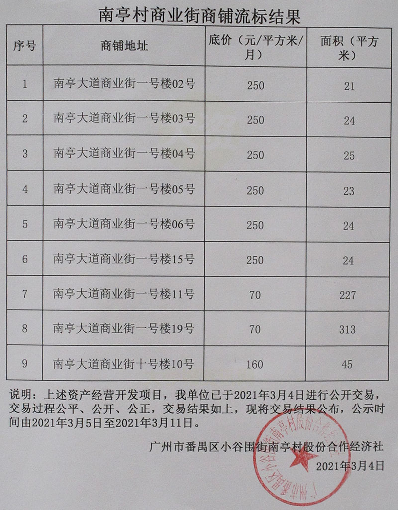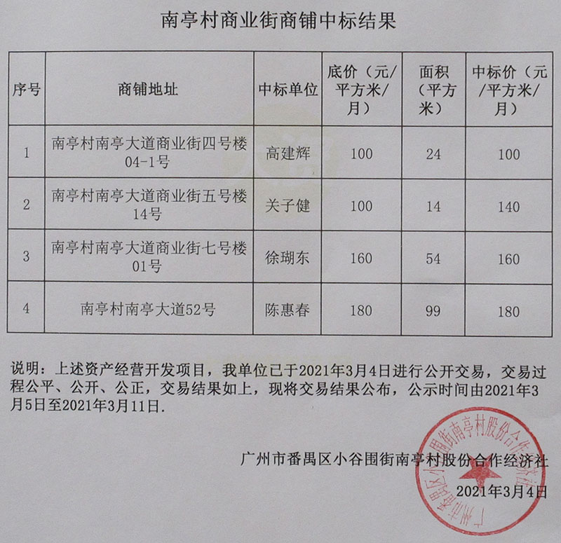 | 商业街部分商铺最新中标结果公示 | ||||||
