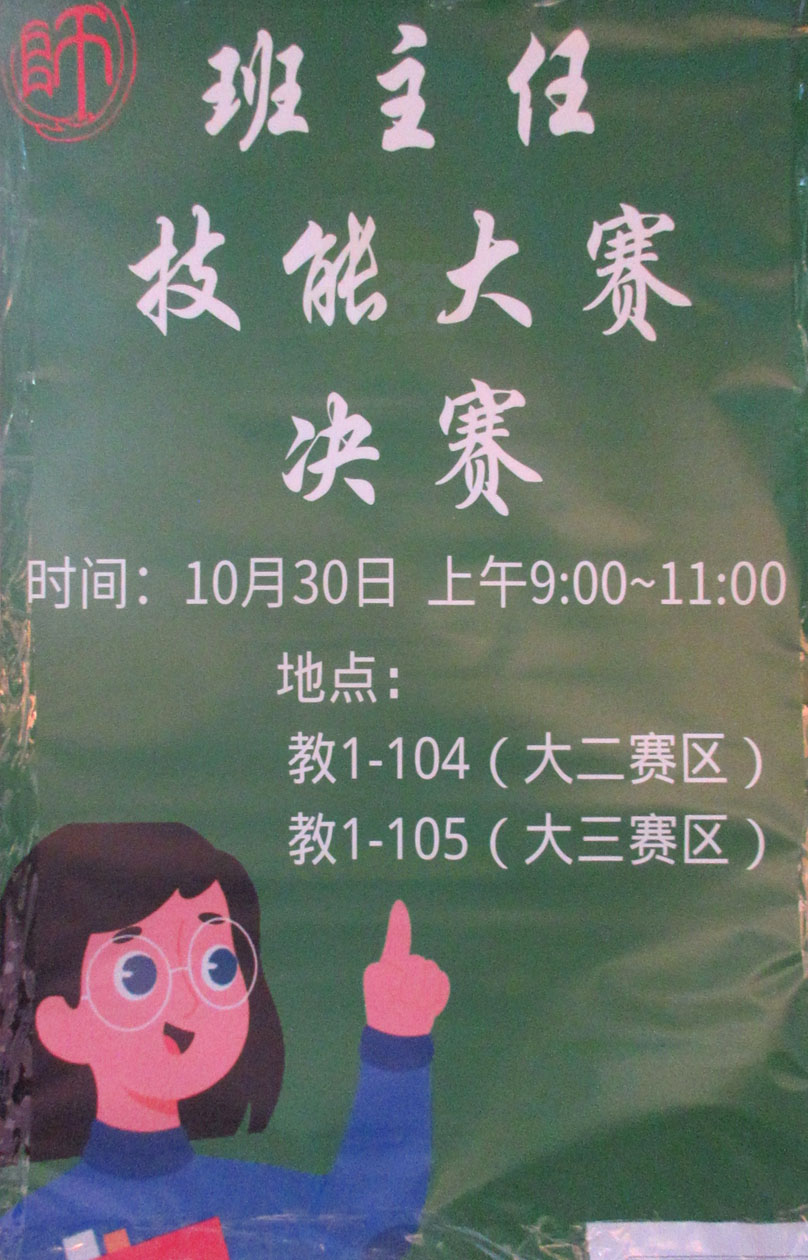 班主任技能大赛决赛 10月30日上午9点--11点 地点:教1-104(大二赛区) 教1-105(大三赛区)