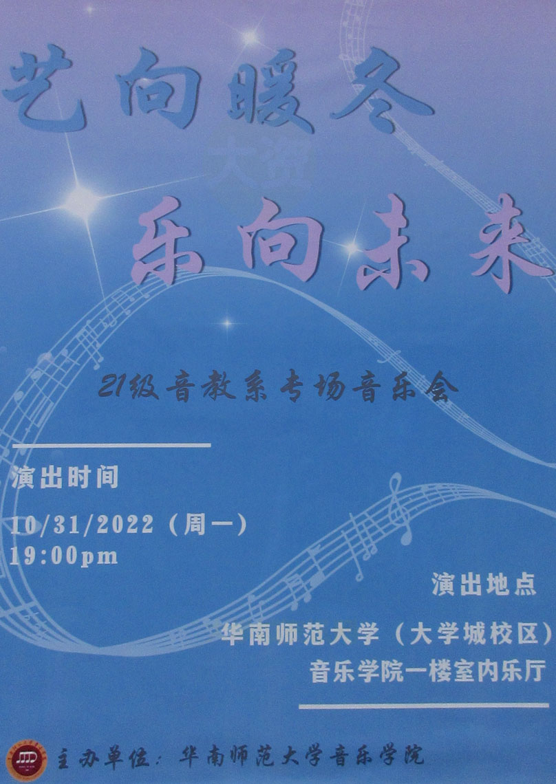 艺向暖冬,乐向未来 2021级音教系专场音乐会 2022.10.31周一晚19点 教学区音乐学院一楼室内乐厅