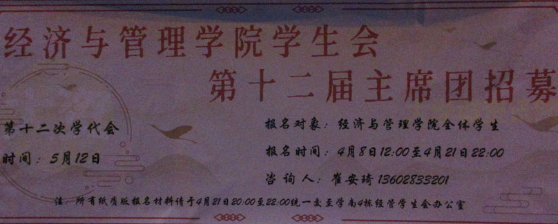 经济与管理学院学生会第十二届主席团招募 报名4月8日-4月21日 面向全体经管学生 第十二次学代会时间5月12日 注:所有纸质版报名材料请于4月21日20点至22点统一交至学南4栋经管学生会办公室