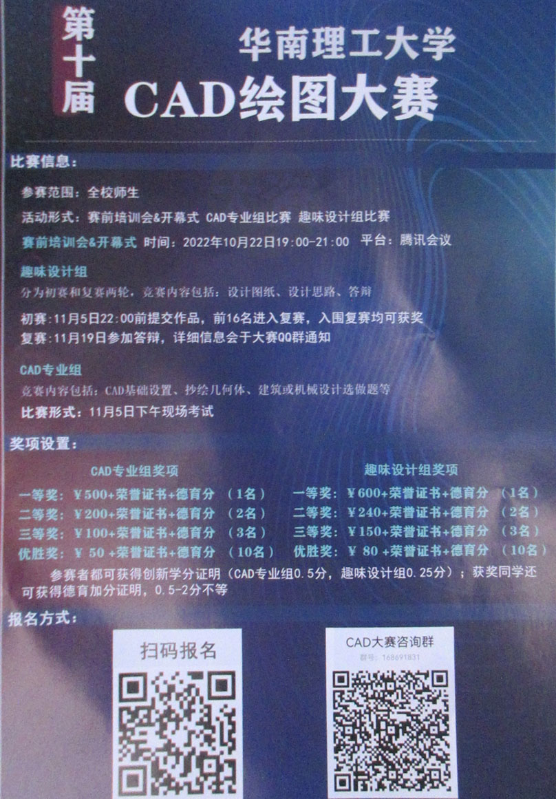 | 华南理工大学第十届CAD绘图大赛 赛前培训会&开幕式-2022年10月22日19点-21点 线上进行 趣味设计组 …… | ||||||