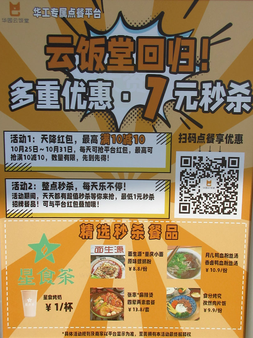 华工云饭堂回归 多重优惠·7元秒杀 活动1:天降红包,最高满10减10 10月25~10月31日,每天可抢平台红包,最高可抢满10减10,数量有限,先到先得 活动2:整点秒杀,每天乐不停 活动期间,天天都有超值秒杀等你来抢,最低1元秒杀招牌餐品,可与平台红包叠加 扫码点餐享优惠 星食茶精选秒杀餐品 |