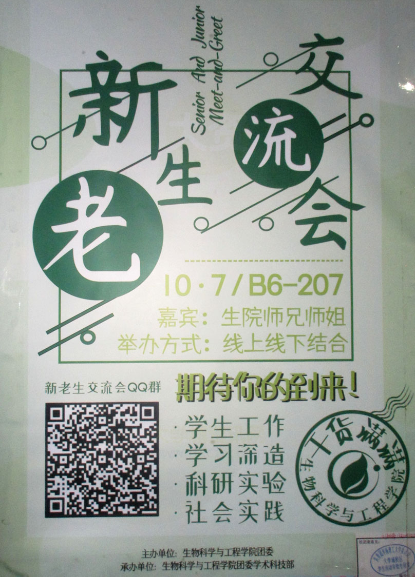 | 华工生科学院新老生交流会 时间10月7号 教学区B6栋207 嘉宾:生院师兄师姐 | ||||||