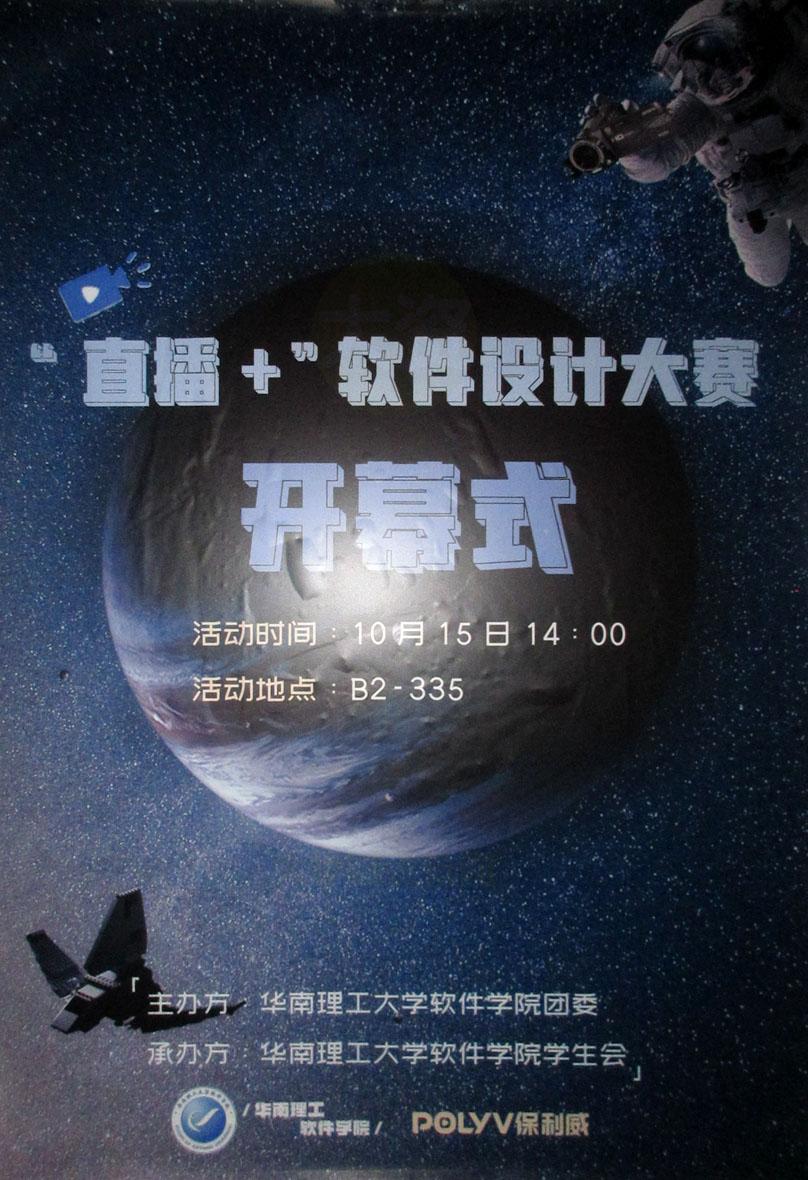 软件学院 直播+软件设计大赛开幕式 10月15日下午14点 教学区B2-335 |