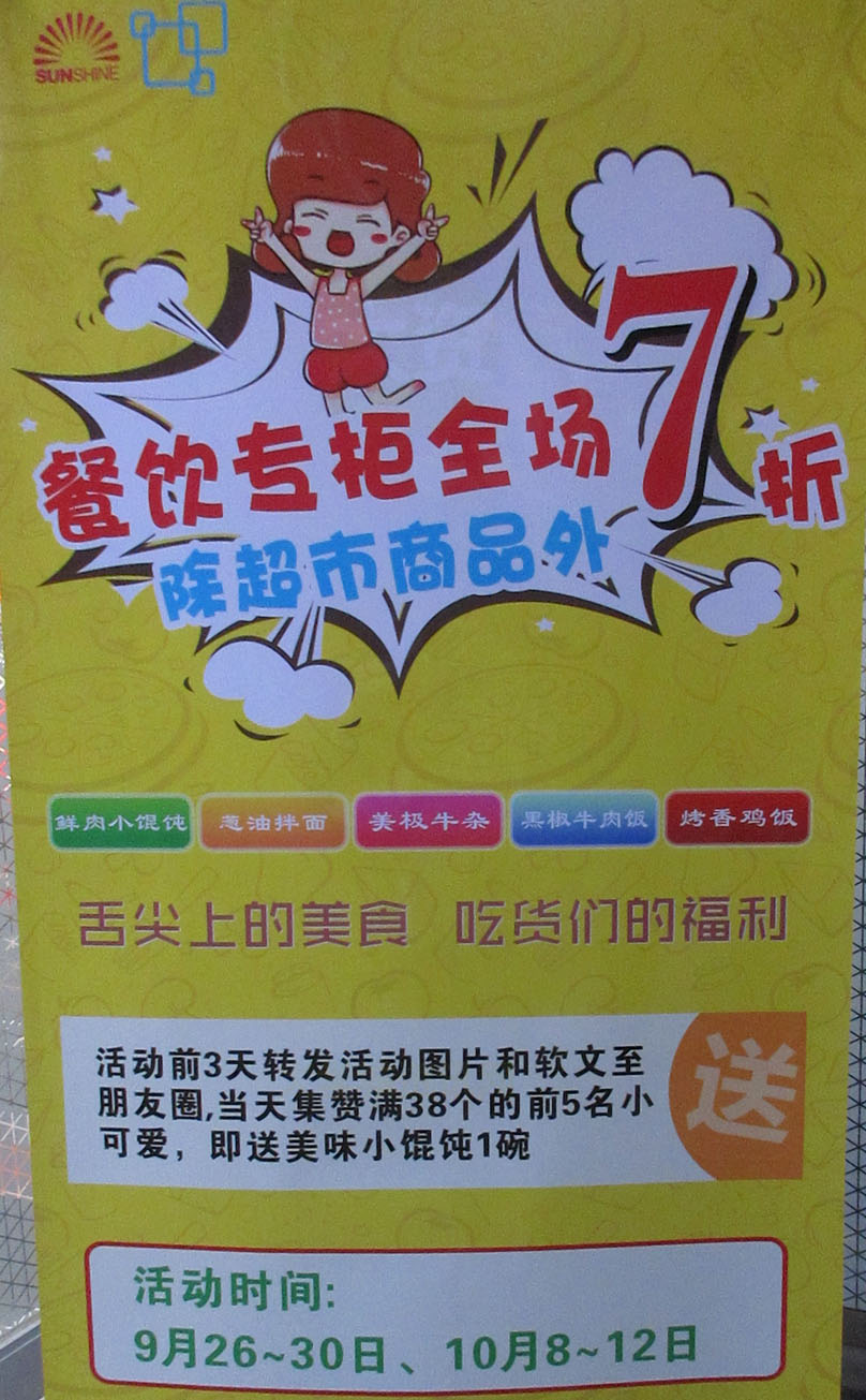 | 生活区明德园1栋 西亚兴安超市 餐饮专区全场7折 活动时间9月26日-30日,10月8日-12日 | ||||||