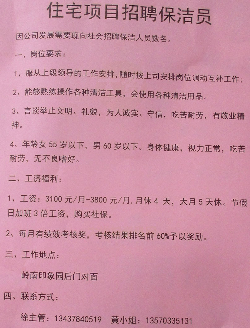 南区-住宅项目招聘保洁员 工资3100-3800元 月休4天 联系徐主管13437840519黄小姐13570335131