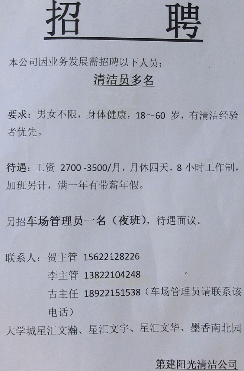 南北区多个楼盘住宅区招聘清洁员多名及夜班车场管理员一名