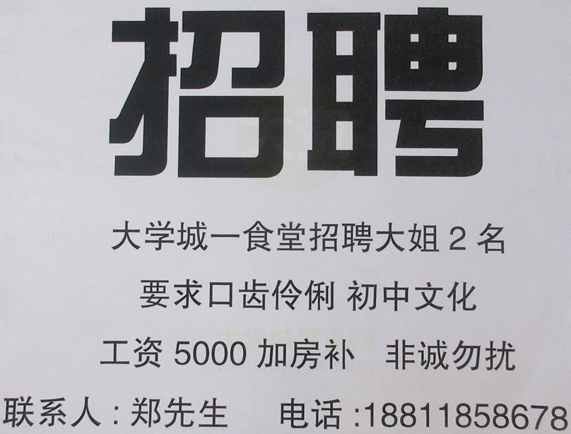 大学城一饭堂招聘大姐2名 要求口齿伶俐,初中文化 工资5000加房补 联系18811858678郑生