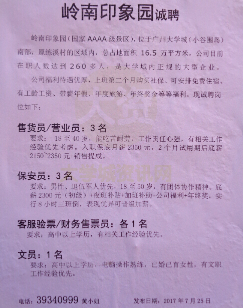 岭南印象园诚聘售货员营业员保安员客服验票员财务售票员文员