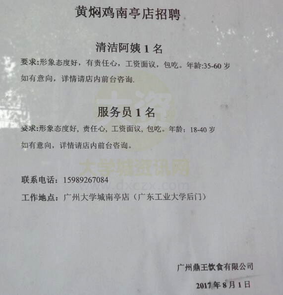 黄焖鸡南亭店招聘清洁阿姨1名服务员1名