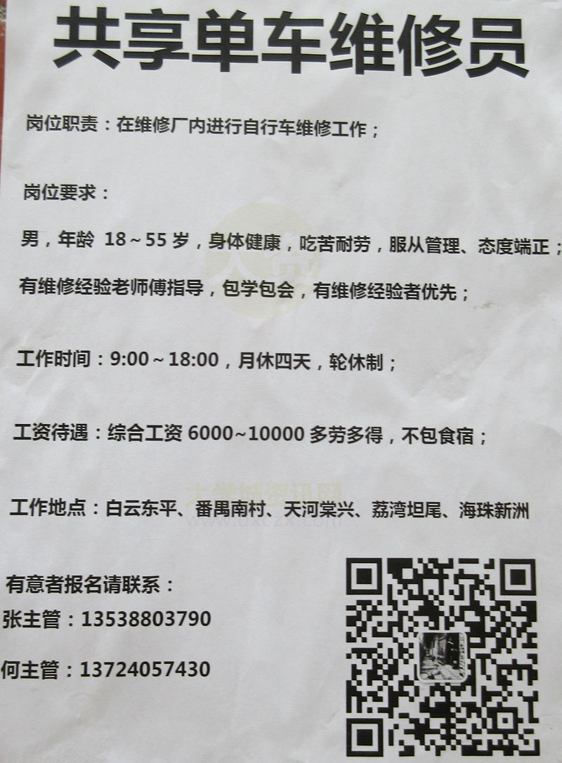 招聘共享单车维修员 岗位职责:在维修厂内进行自行车维修工作 有维修师傅教带指导