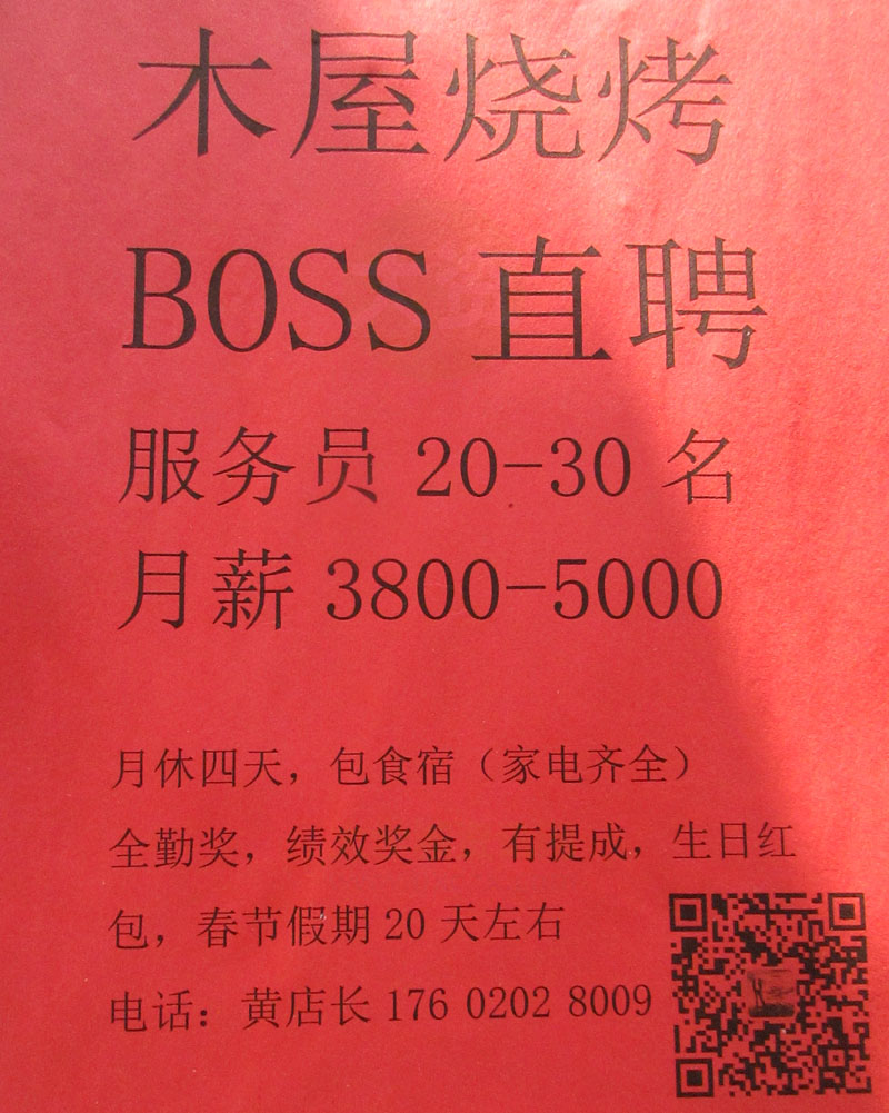 贝岗木屋烧烤BOSS直聘 服务员20-30名 月薪3800-5000