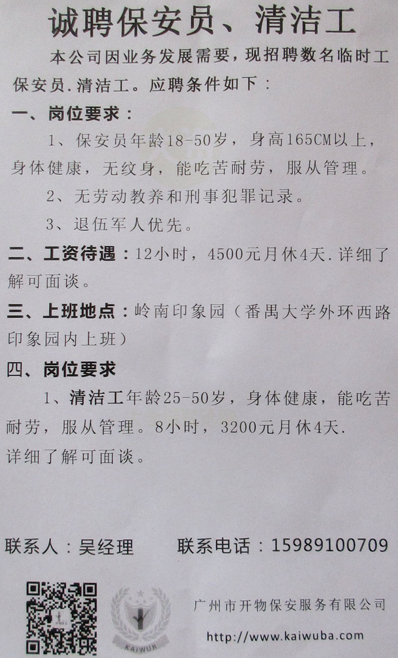 广州市开物保安服务有限公司(岭南印象园)诚聘保安员、清洁工