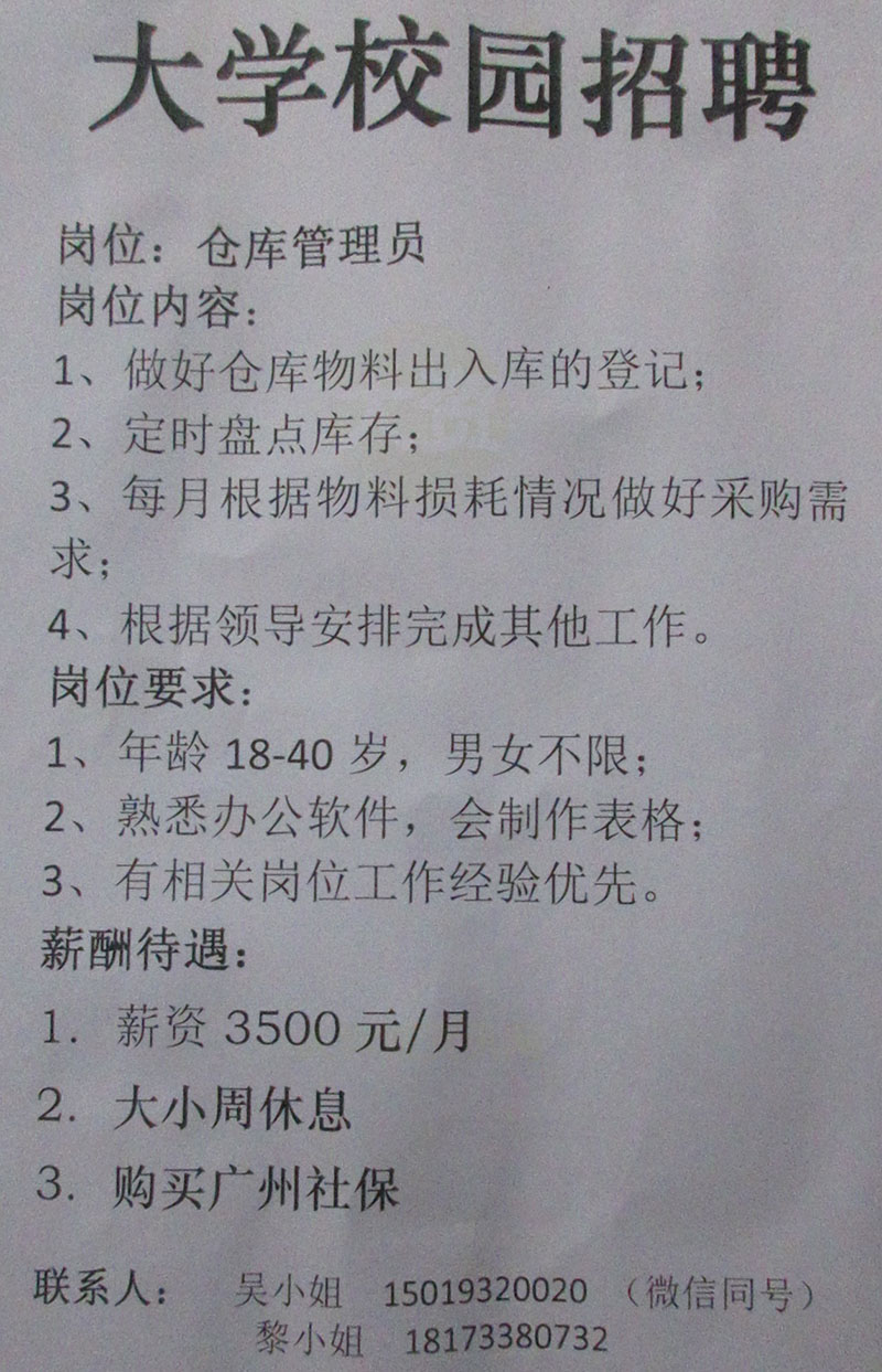 大学校园(仓库管理员)招聘 薪资3500元/月 大小周休息 购买广州社保 15019320020